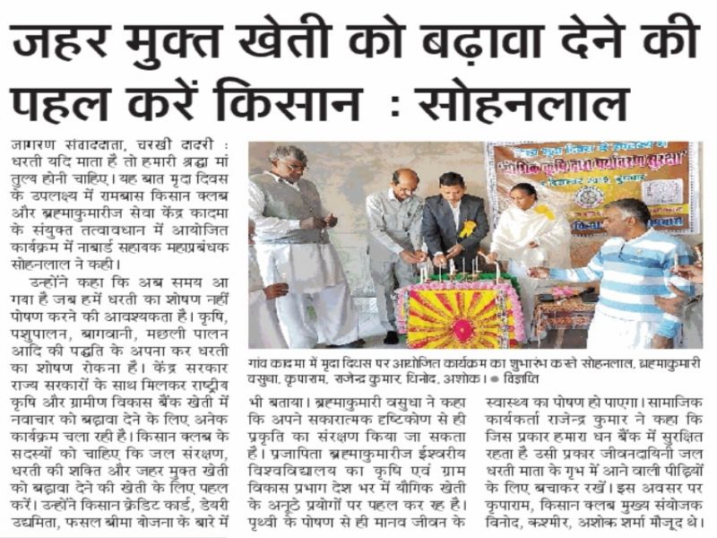 धरती यदि माता है तो हमारी श्रद्धा मां तुल्य होनी चाहिए। यह तभी संभव है जब हम शाश्वत योगिक खेती को बढ़ावा दें मृदा दिवसके उपलब्य में रामबास किसान क्लब और ब्रह्माकुमारीज सेवाकेंद्र कादमा के संयुक्त तत्वावधान में आयोजित कार्यक्रम “यौगिक कृषि द्वारा पर्यावरण सुरक्षा” विषय पर बतौर मुख्य अतिथि नाबार्ड सहायक जिला महाप्रबंधक सोहनलाल ने ये विचार व्यक्त किए। आयोजन में उपस्थित किसानों से नाबार्ड अधिकारी ने आग्रह किया कि अब समय आ गया है जब हमें धरती का शोषण नहीं पोषण करने की आवश्यकता है। कृषि, पशुपालन, बागवानी, आदि में शाश्वत पद्धति को अपना कर धरती का शोषण रोकना है। केंद्र सरकार राज्य