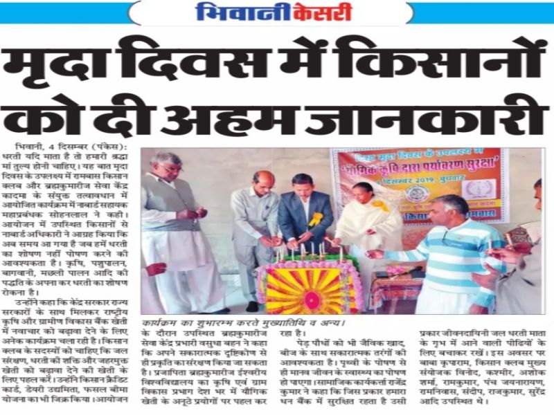बढ़ावा देने की खेती के लिए पहल करे। सोहनलाल ने ब्रह्मा कुमारी द्वारा शाश्वत योगिक खेती को अपनाकर जो सफल प्रयास किए उनकी भूरी -भूरी प्रशंसा करते हुए कहा की अध्यात्म के बिना हम जीवन व मिट्टी को नहीं बचा पाएंगे। उन्हांेने किसान क्रेडिट कार्ड, डेयरी उद्यमिता, फसल बीमा योजना का भी जिक्र किया। आयोजन के दौरान ब्रह्माकुमारीज सेवाकेंद्र प्रभारी वसुधा बहन ने कहा कि अपने