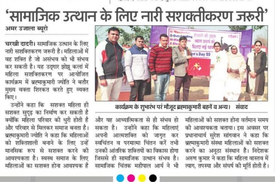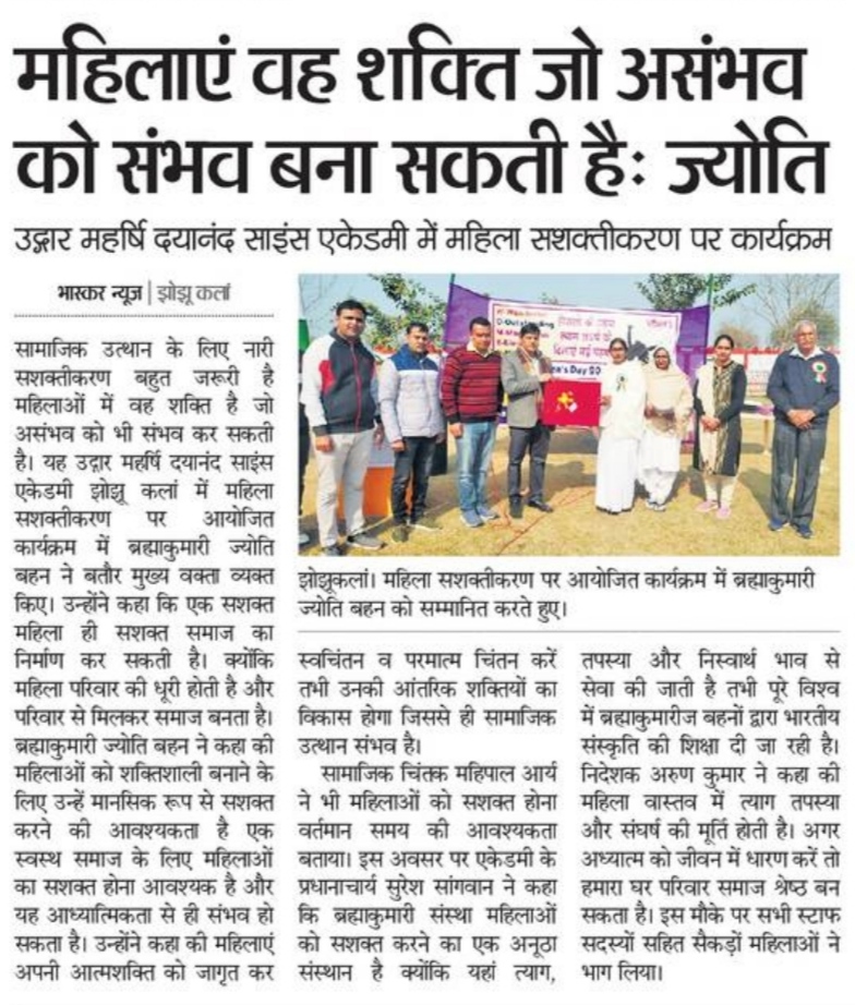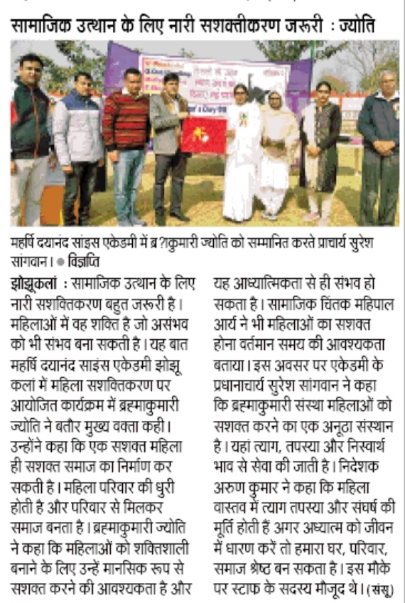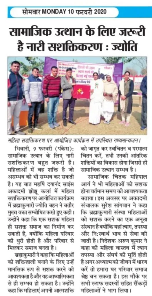 झोझू कलां-कादमा (हरियाणा):—सामाजिक उत्थान के लिए नारी सशक्तिकरण बहुत जरूरी है महिलाओं में वह शक्ति है जो असंभव को भी संभव कर सकती है यह उद्गार महर्षि दयानंद साइंस एकेडमी झोझू कलां में महिला सशक्तिकरण पर आयोजित कार्यक्रम में प्रजापिता ब्रह्माकुमारी ईश्वरीय विश्वविद्यालय कादमा से ब्रह्माकुमारी ज्योति बहन ने बतौर मुख्य वक्ता व्यक्त किए। उन्होंने कहा कि एक सशक्त महिला ही सशक्त समाज का निर्माण कर सकती है क्योंकि महिला परिवार की धूरी होती है और परिवार से मिलकर समाज बनता है। ब्रह्माकुमारी ज्योति बहन ने कहा की महिलाओं को शक्तिशाली बनाने के लिए उन्हें मानसिक रूप से सशक्त करने की आवश्यकता है एक स्वस्थ समाज के लिए महिलाओं का सशक्त होना आवश्यक है और यह आध्यात्मिकता से ही संभव हो सकता है। उन्होंने कहा की महिलाएं अपनी आत्मशक्ति को जागृत कर स्वचिंतन व परमात्म चिंतन करें तभी उनकी आंतरिक शक्तियों का विकास होगा जिससे ही सामाजिक उत्थान संभव है। सामाजिक चिंतक महिपाल आर्य ने भी महिलाओं को सशक्त होना वर्तमान समय की आवश्यकता बताया। इस अवसर पर एकेडमी के प्रधानाचार्य सुरेश सांगवान ने कहा कि ब्रह्माकुमारी संस्था महिलाओं को सशक्त करने का एक अनूठा संस्थान है क्योंकि यहां त्याग, तपस्या और निस्वार्थ भाव से सेवा की जाती है तभी पूरे विश्व में ब्रह्माकुमारीज बहनों द्वारा भारतीय संस्कृति की शिक्षा दी जा रही है। निदेशक अरुण कुमार ने कहा की महिला वास्तव में त्याग तपस्या और संघर्ष की मूर्ति होती है अगर अध्यात्म को जीवन में धारण करें तो हमारा घर परिवार समाज श्रेष्ठ बन सकता है। इस मौके पर सभी स्टाफ सदस्यों सहित सैकड़ों महिलाओं ने भाग लिया