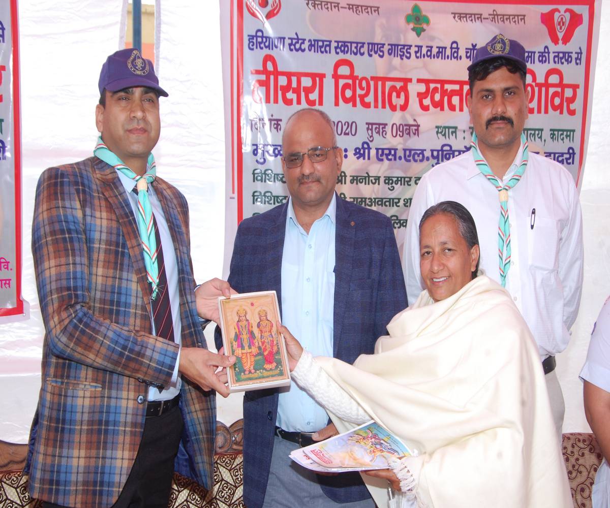 कादमा(हरियाणा):–भारत स्काउट्स एवं गाइड्स के तत्वावधान में राजकीय वरिष्ठ माध्यमिक विद्यालय कादमा में आयोजित रक्तदान शिविर में जिला उपायुक्त श्याम लाल पुनिया आई ए एस के साथ ब्रह्माकमारी वसुधा बहन कादमा सेवाकेंद्र प्रभारी ने शिरकत की और कहा कि रक्तदान महादान है जिससे हम किसी के जीवन को बचा सकते हैं यह निस्वार्थ भाव से की गई सेवा है बहन वसुधा ने कहां की हम सकारात्मक सोच के साथ रक्त का दान करें तो उसके परिणाम भी सकारात्मक होंगे और यह अध्यात्म को जीवन में धारण करने से सहज संभव हो पाएगा। बतौर मुख्य अतिथि जिला उपायुक्त भ्राता श्याम लाल पुनिया आईएएस ने कहा की रक्तदान सर्वोत्तम समाज सेवा है इससे बड़ा कोई दान नहीं लेकिन इस सेवा के साथ-साथ अपने जीवन में नैतिक और मानवीय मूल्यों को धारण करना चाहिए तभी हम समाज का उत्थान कर सकते हैं। इस मौके पर बाढड़ा खंड शिक्षा अधिकारी दयानंद ने कहा की छात्रों को नई दिशा देने का सामाजिक भावना पैदा करने का काम कर रहा है भारत स्काउट्स एवं गाइड्स। इस मौके पर विद्यालय में मां सरस्वती की मूर्ति स्थापित की गई जिस पर जिला उपायुक्त श्याम लाल पुनिया एवं ब्रह्माकुमारी वसुधा बहन ने दीप प्रज्वलन किया। इस अवसर पर भारत स्काउट्स एवं गाइड्स के संयोजक प्राध्यापक पवन कुमार ने सभी का आभार व्यक्त किया। ब्रह्माकुमारी वसुधा बहन ने जिला उपायुक्त श्याम लाल पुनिया आईएएस को ईश्वरीय सौगात भेंट की तथा ब्रह्माकुमारीज़ संस्था द्वारा की जा रही सेवाओं की चर्चा की।